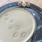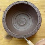 Nun kann Dein Werk direkt mit einer Engobe mit dem Pinsel farblich angemalt und ein Schriftzug oder Muster eingeritzt werden. (Sgrafittotechnik)