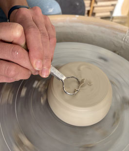 Wenn Dein Werk lederhart getrocknet ist, wird Dein Gefäß anders rum auf der Scheibe fixiert und mit Abdrehschlingen der Boden modelliert.