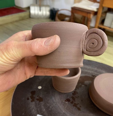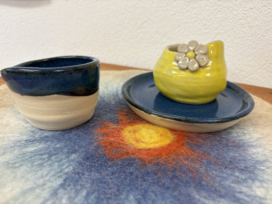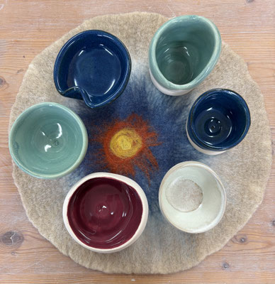 Beim Töpfern ist es essenziell, erst einmal selbst zentriert zu sein. Alles beginnt aus der Ruhe heraus. Ich spüre mich, den Ton und meine Absicht, was ich in meinem Bewusstsein gestalten will. Mit Geduld und Freude machen wir uns ans Werk - dazu zählt auch das lustvolle Scheitern, falls es den Ton wieder aus der Zentrierung schleudert und alles zu eiern beginnt ;-) - umso größer ist dann die Freude, wenn nach und nach ein Werk nach dem anderen gelingt.