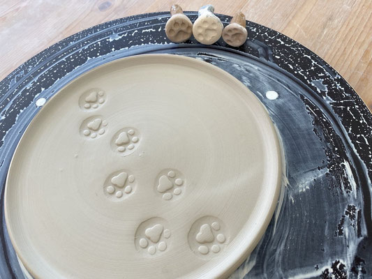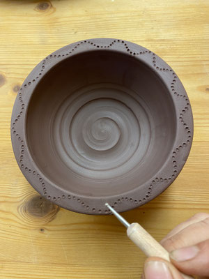 Nun kann Dein Werk direkt mit einer Engobe mit dem Pinsel farblich angemalt und ein Schriftzug oder Muster eingeritzt werden. (Sgrafittotechnik)